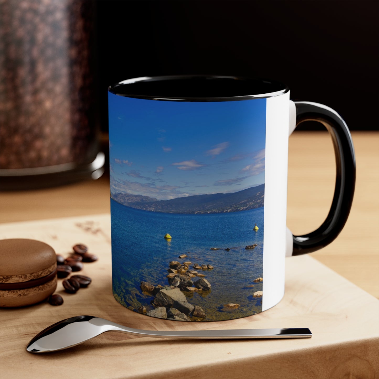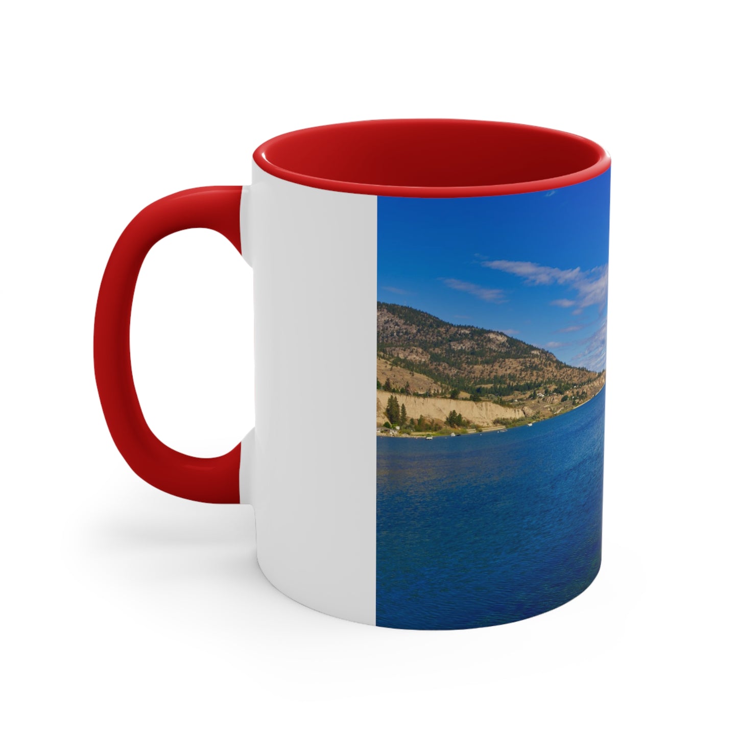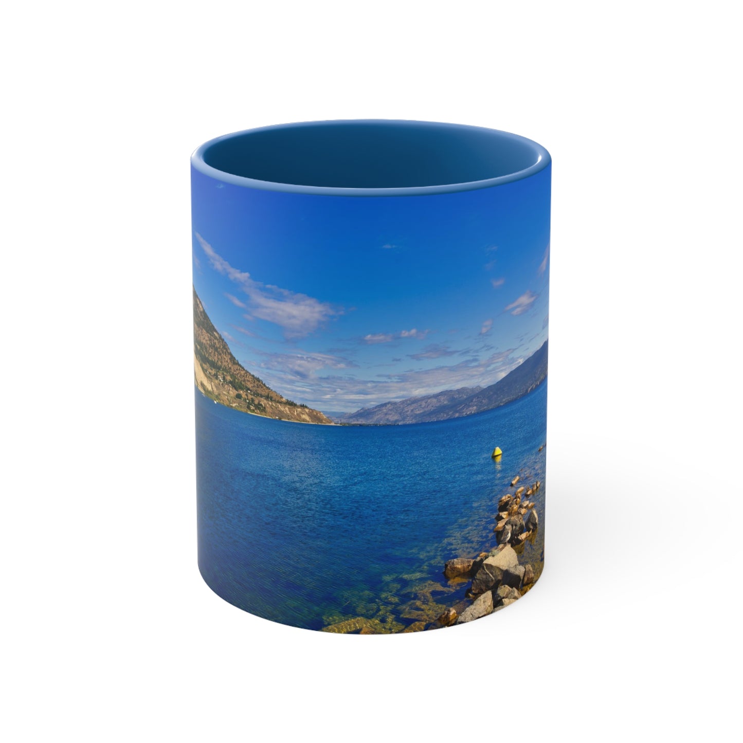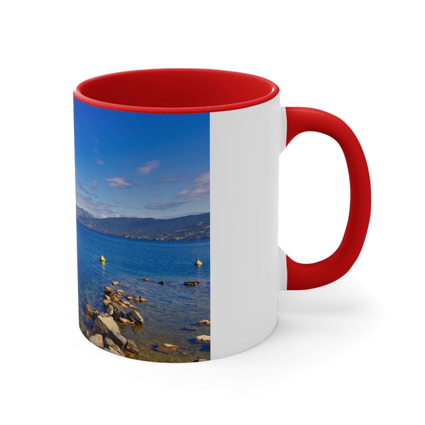 Get this 11oz accent mug with the image of Okanagan Lake in Penticton from the natural pier in the daytime.