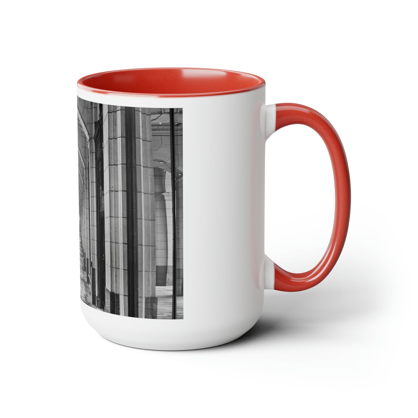 Get this 15oz accent coffee mug with the black and white edited image of the Hudson's Bay sidewalk in Downtown Calgary.