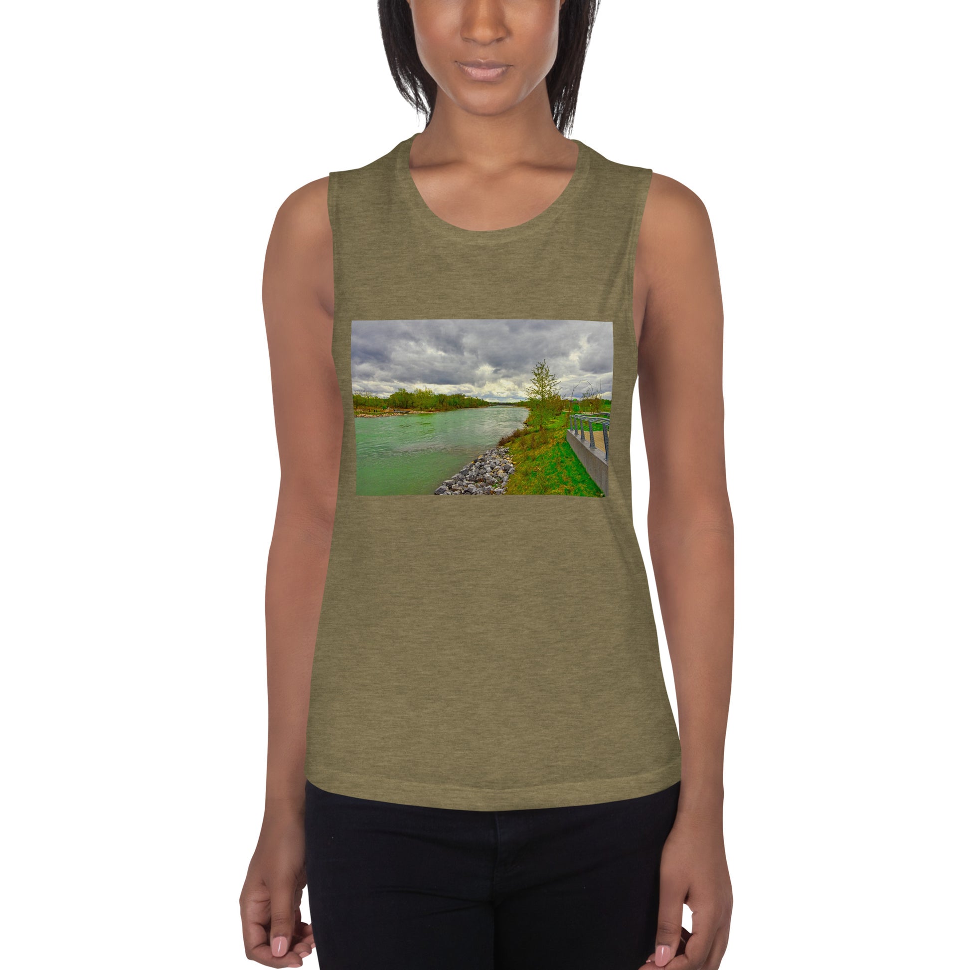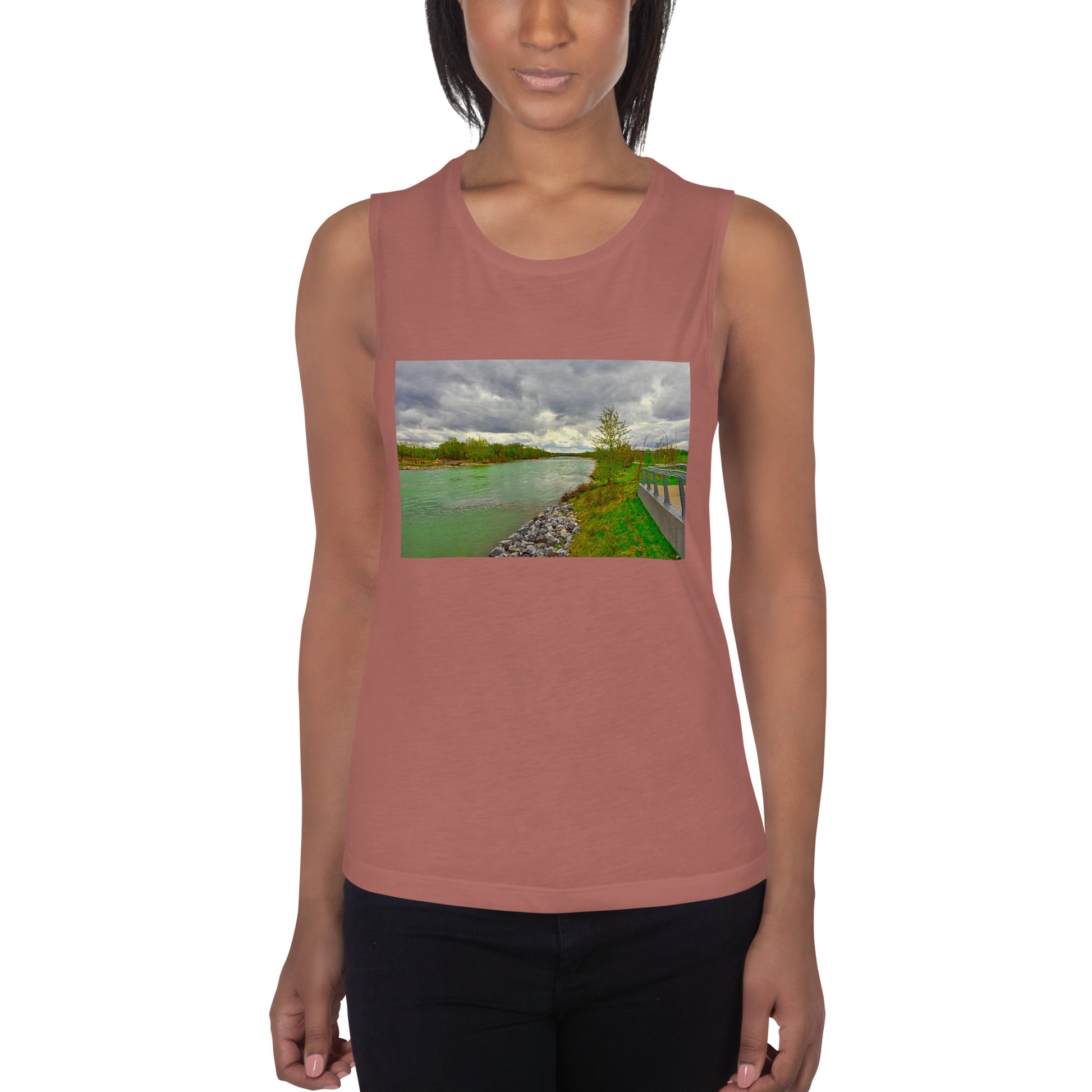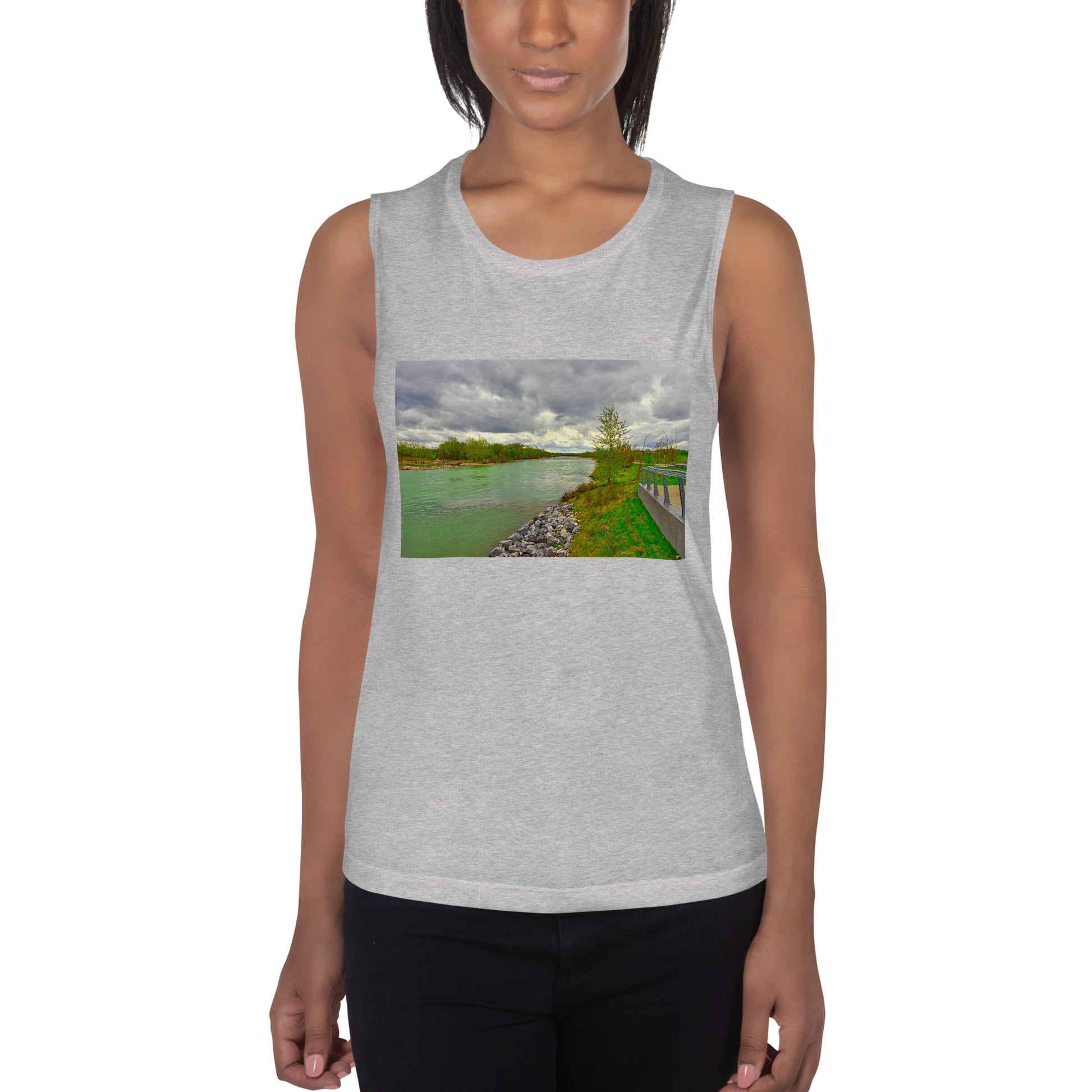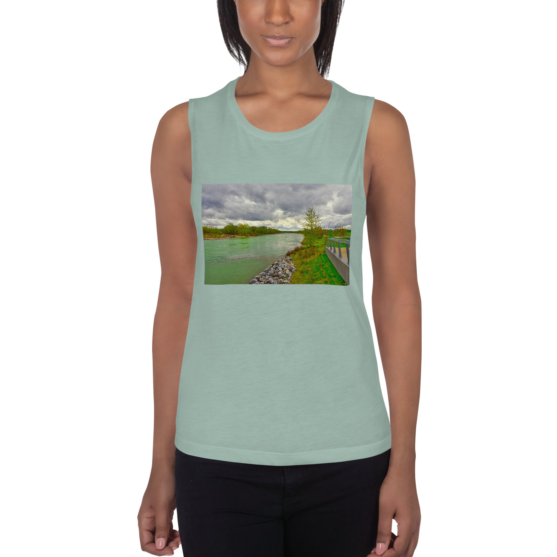 Get this women's muscle tank top with the image of the Bow River flowing the the East Village.
