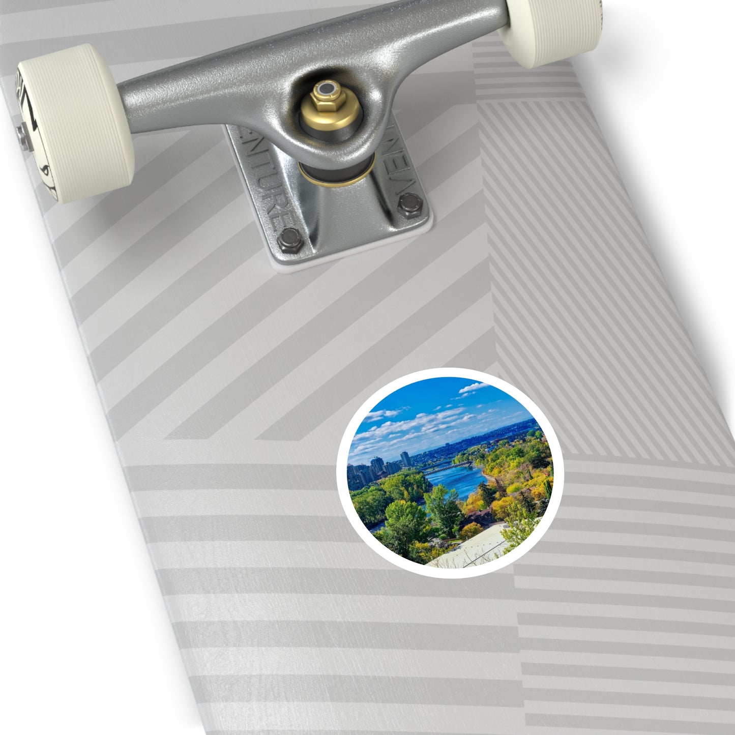 Get these round stickers with the HDR edited image of the Bow River and Peace Bridge as seen from McHugh Bluff in the fall.