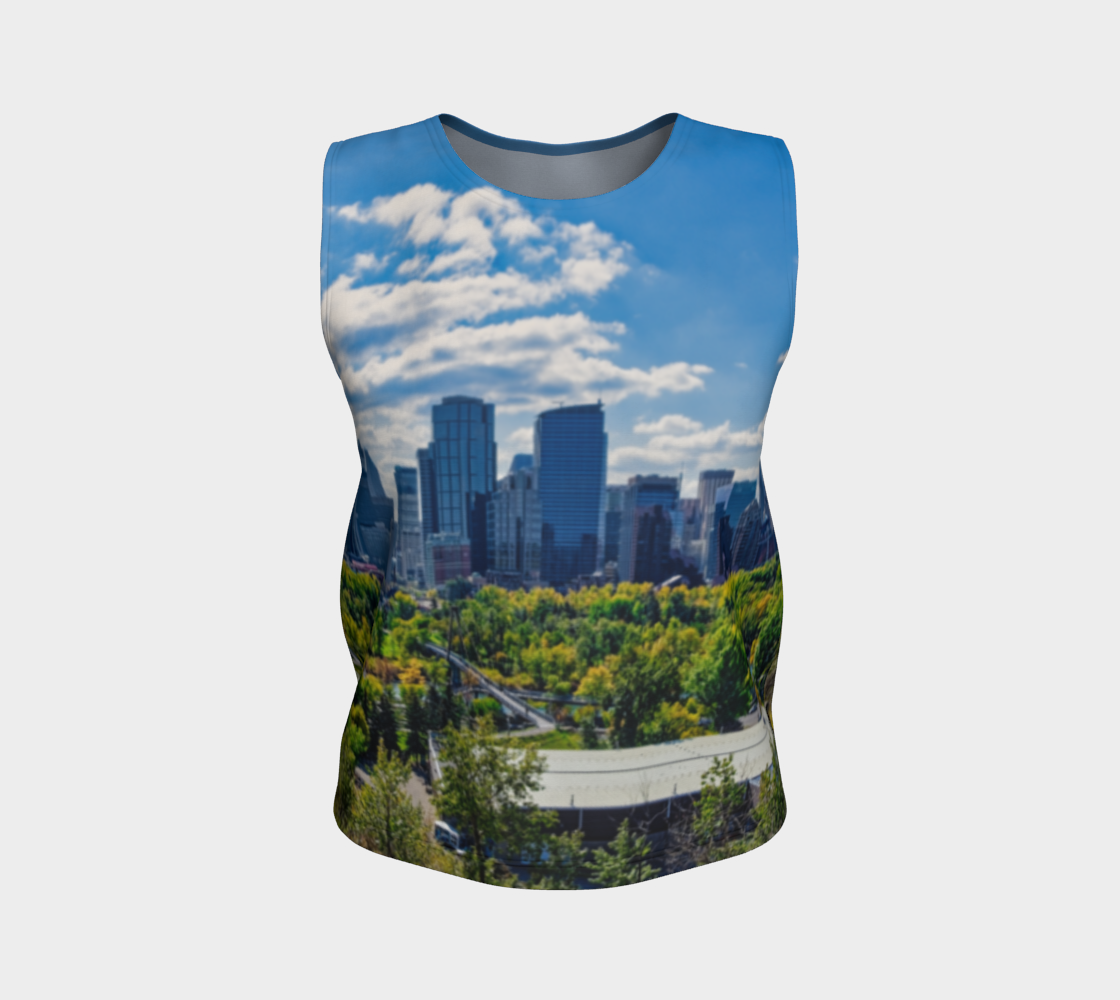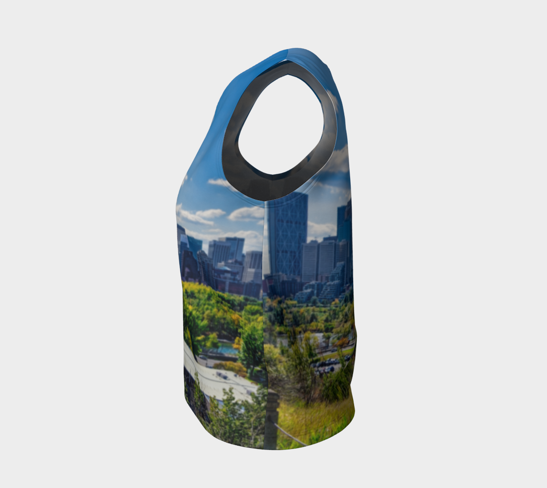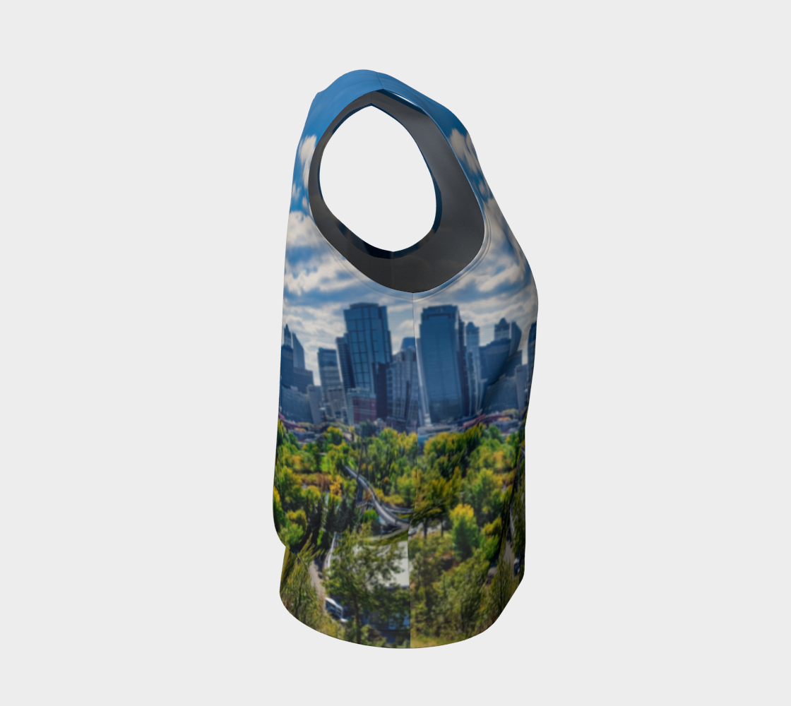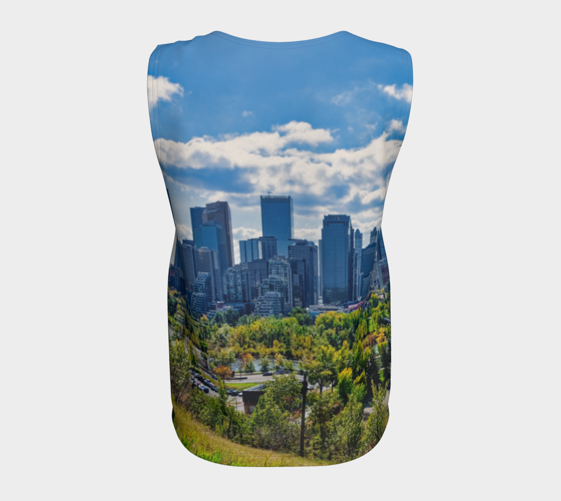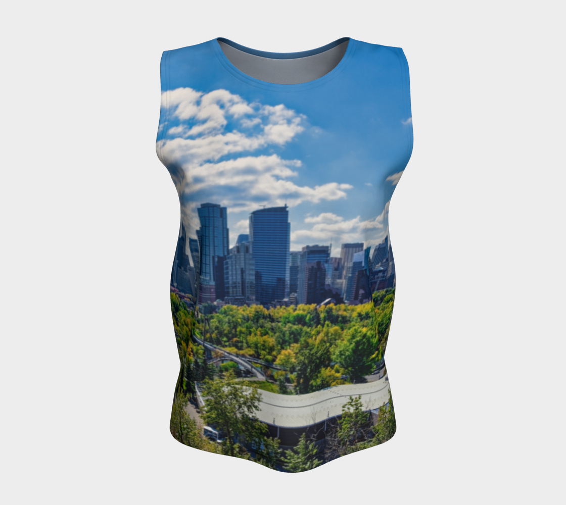 Get this women's loose long tank top with the image of the Downtown Calgary skyline as seen from McHugh Bluff in the fall.