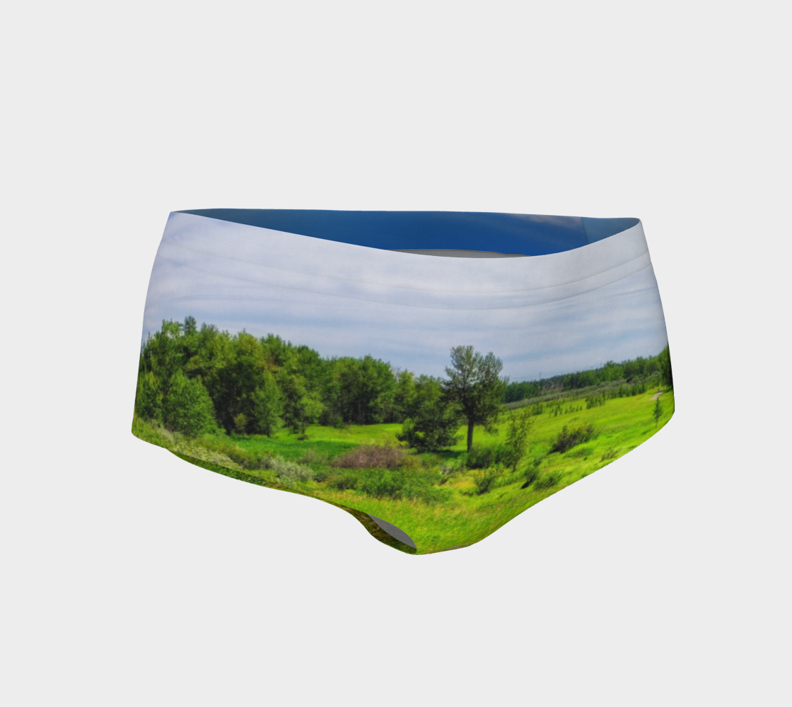Get these women's mini shorts with the image of one of the meadows at Votier's Flats in Fish Creek Park.